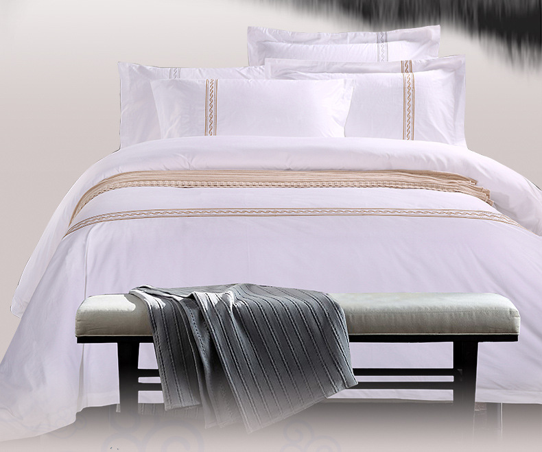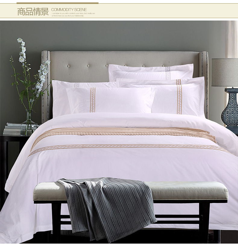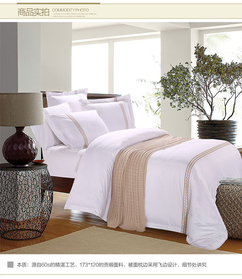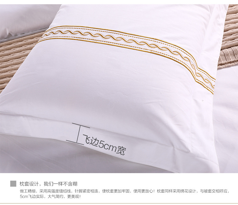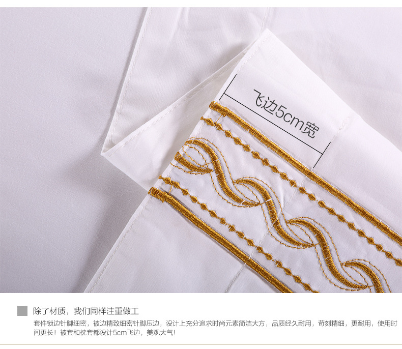 店全棉贡缎床上四件套 60支白色纯棉床单被套金色绣花床上用品 190*240cm